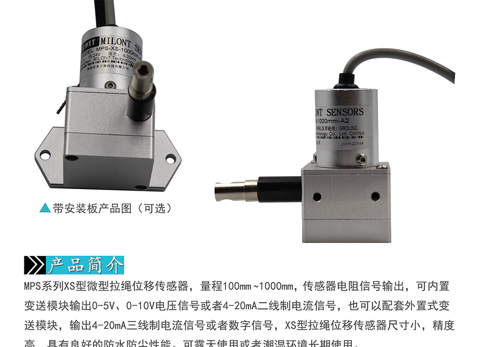MPS series XS type micro cable?displacement sensor, the range of 100mm~1000mm, the sensor resistance signal output, can be built in the transformer module output 0~5V, 0-10V voltage signal or 4-20mA two-wire current signal, can also be matched with the external transformer module, output 4-20mA three-wire current signal or digital signal,?XS type drawstring displacement sensor has the advantages of small size, high precision and good waterproof and dustproof performance.?It can be used outdoors or in wet environment for a long time.
