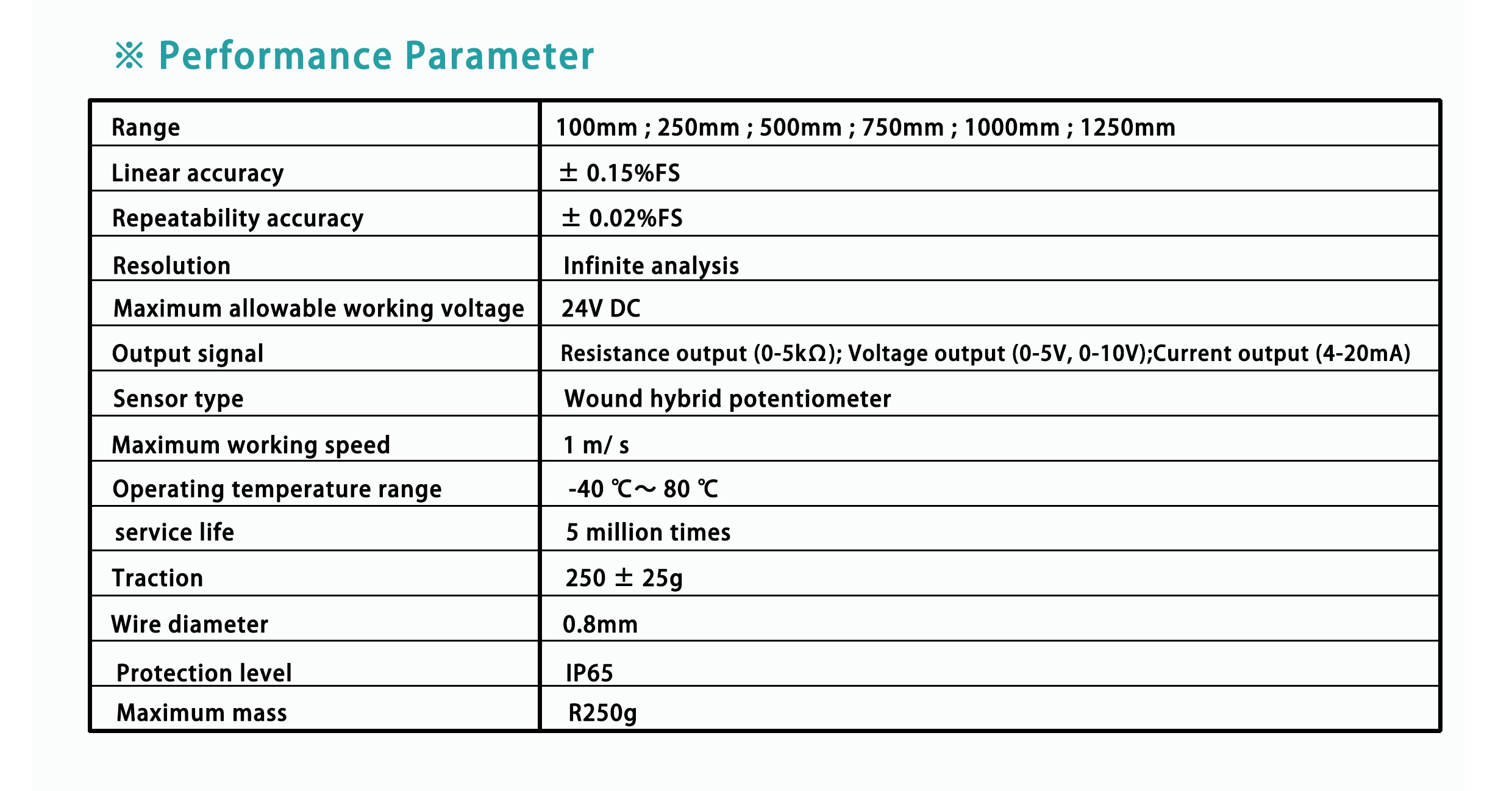 Output signal: resistance output0-5KΩ; Voltage signal (0-5V, 0-10V); Current signal (4-20mA)